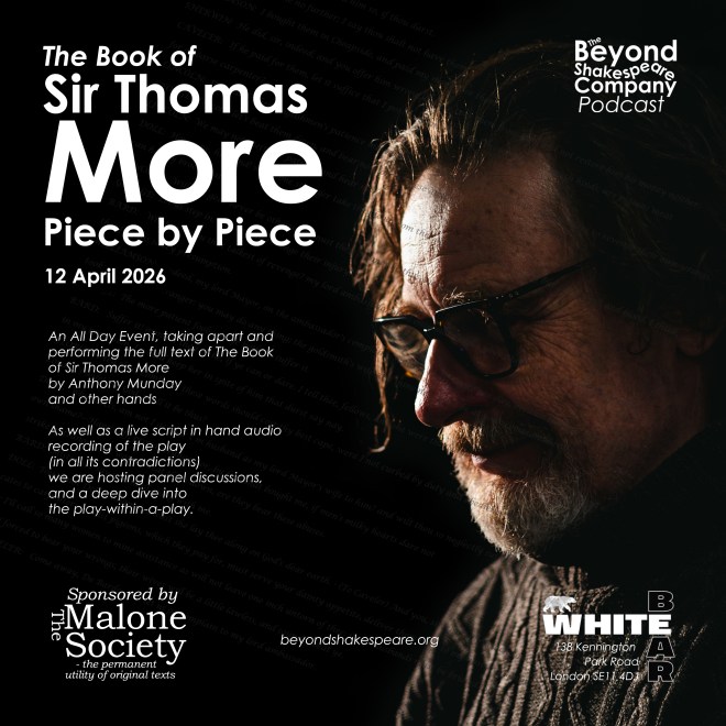 On Sunday 12th April we’re presenting the complete text of The Book of Sir Thomas More in a day long event at the White Bear Theatre. Thanks to the Malone society, we will be presenting the audience with complementary copies of either the play itself, or one of the plays within a play. The audience will then be introduced to the Book over the course of a long form deep dive, with a live script in hand audio recording of the complete text (or as close to complete as we can make it) followed by panel discussions and a detailed look at the play within a play and the sources that made it.