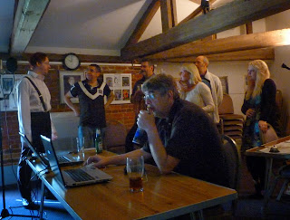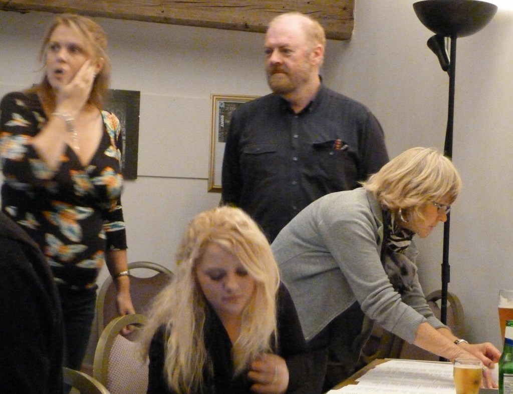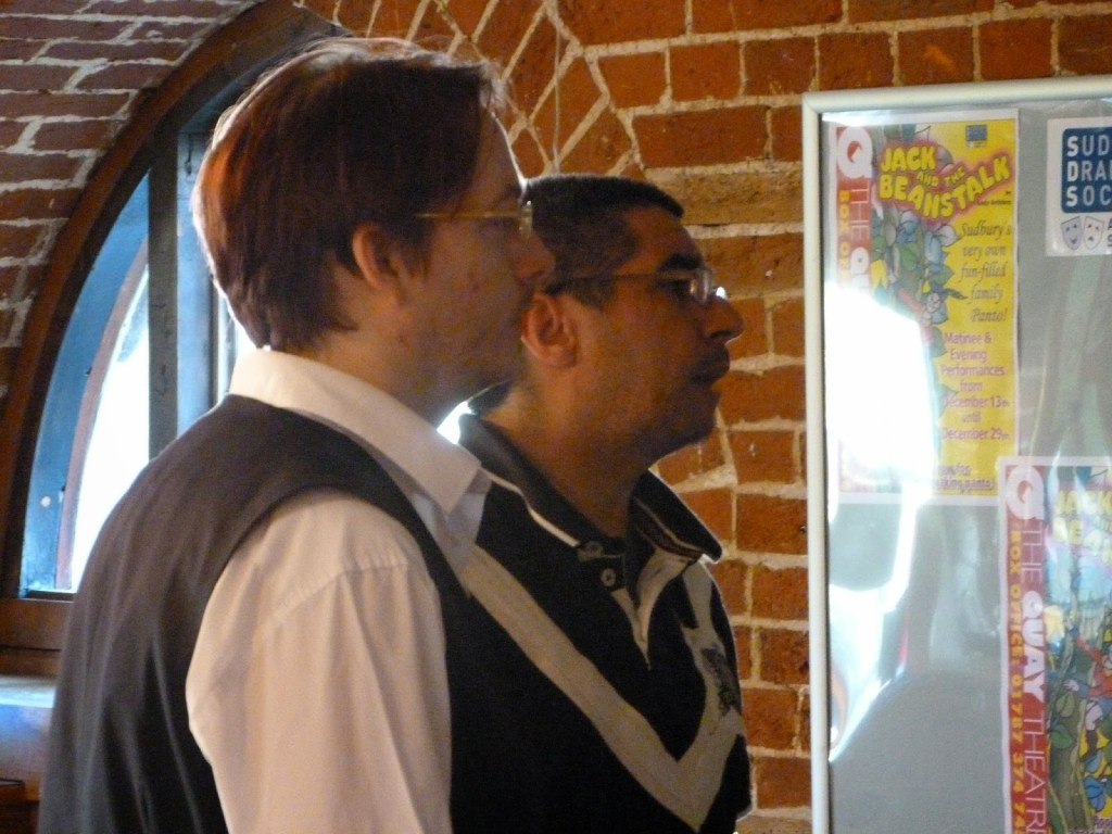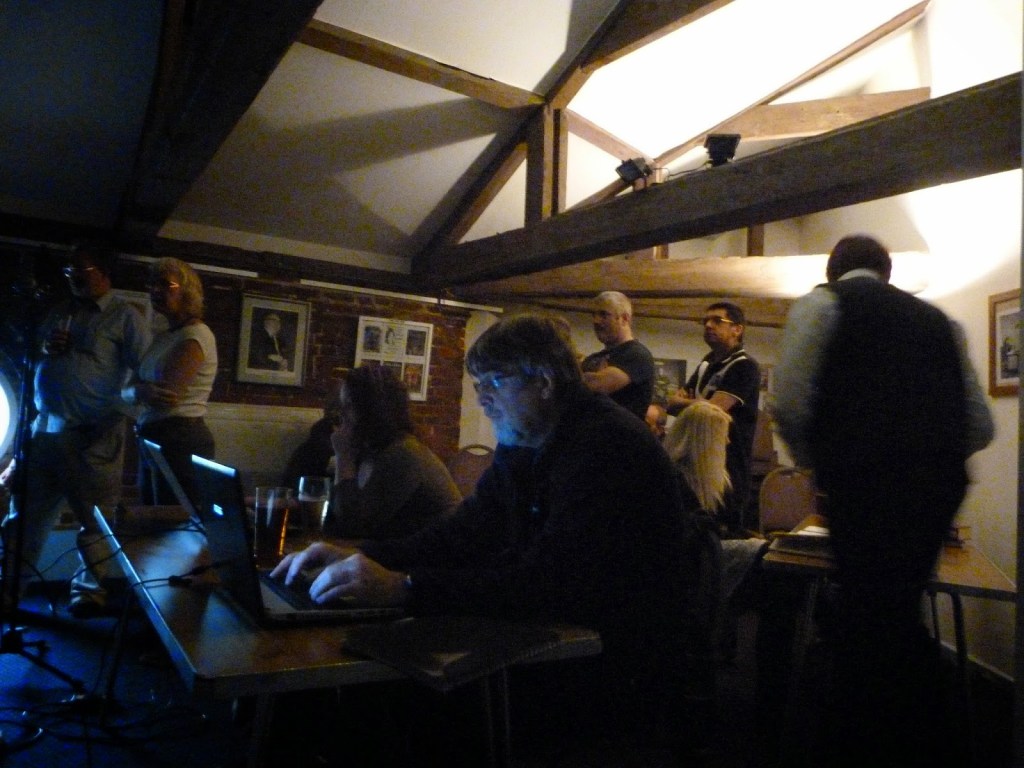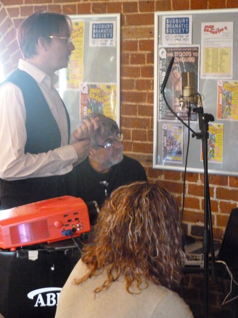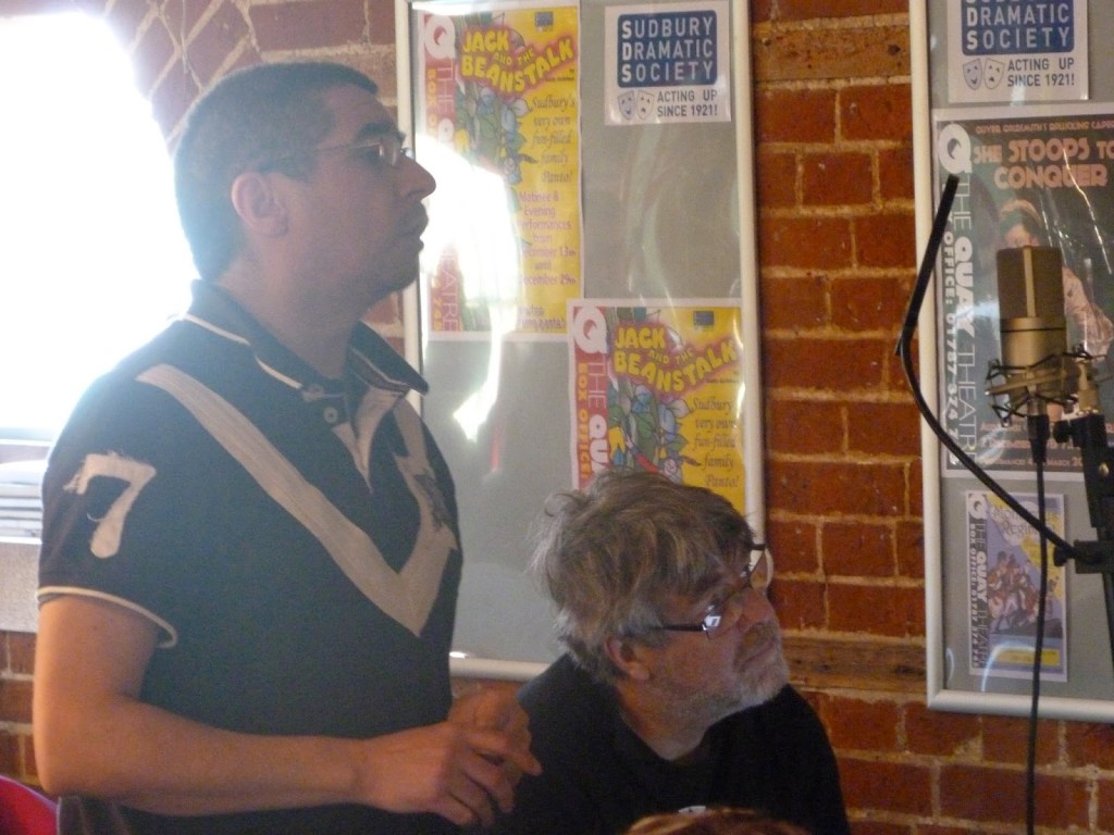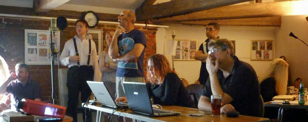 Robert addressing the microphone – Tim Regester (background) doing the live streaming –Kevin Roychowdhury at the microphoneMichael Harding at the microphoneMarion Tuke at the autocueLiz Cole as the SybilRobert and Kevin standing byAdam Webster with Kevin, following the script
