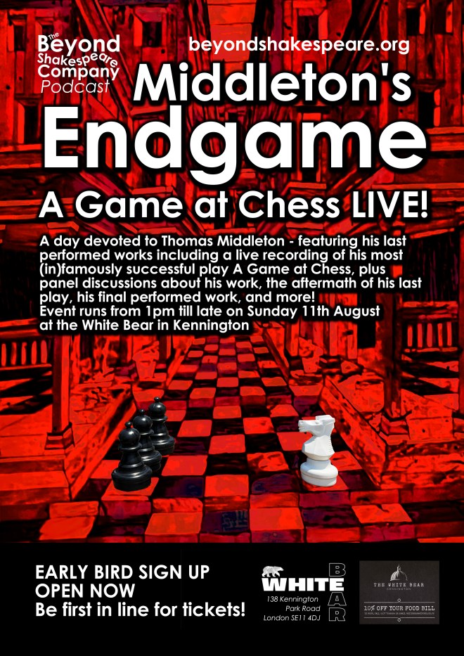At the same time as reading the show on zoom (quite literally, there was a reading on zoom at the same time as we ran the play on Sunday 11th August) we also produced a pop up Middleton festival, Middleton’s Endgame: A Game at Chess LIVE!, at The White Bear in Kennington, featuring a live performance of A Game at Chess, discussions of the play, a look at Middleton’s last public work, the 1626 Lord Mayor’s show, and other selections of writing from across his life. As the blurb said: “A Game at Chess, a play featuring chess pieces in a cold war one side against the other, was performed nine times in a row in 1624, a scandalous event that ended his career. Beyond will be recording the play live for the podcast, as well as other works and material from the end of Middleton’s career. With expert discussion, and even a whole Lord Mayor’s Show, this is not to be missed.” And it really wasn’t.