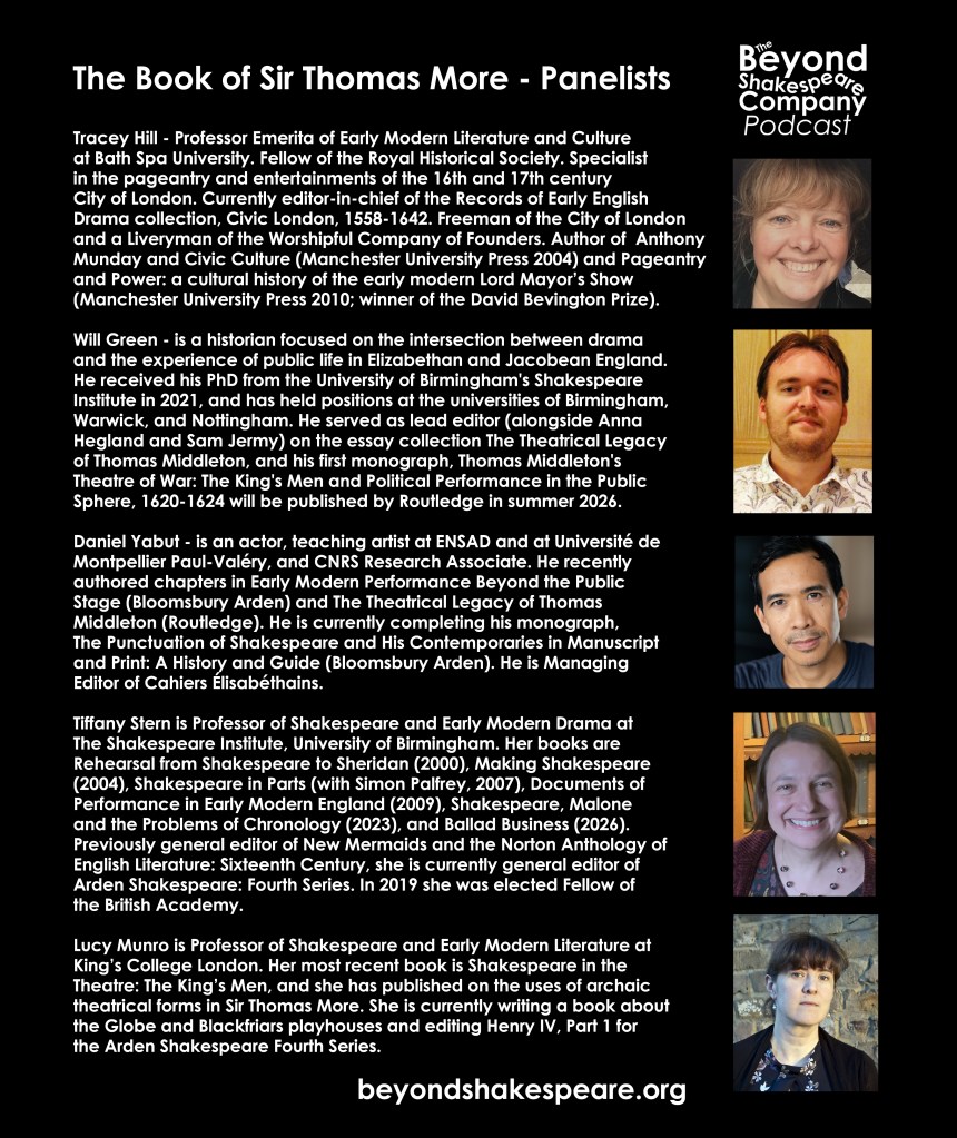 Join us for our latest deep dive into a play full of history and mischief. Our newest all day event is covering the manuscript play of Sir Thomas More by Anthony Munday, with a little help from his friends. The text of the play will be performed in full, covering all the twists and turns of a manuscript being written, rewritten, and censored by the Master of the Revels.